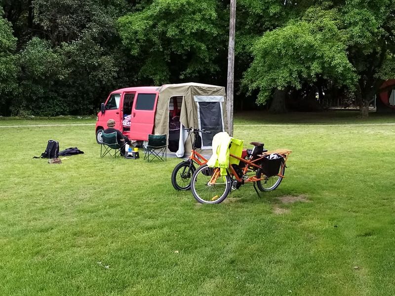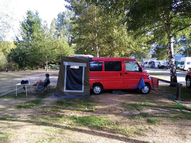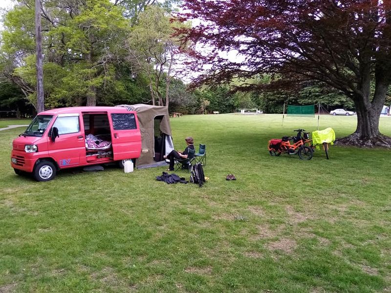 We did our camping trip to Otaki Forks and then over to Pahiatua in our Miev Minicab eCamper! The awning on the back is from intenze.co.nz, and is designed to go on a Totota Hi-Ace, but we got it to fit. Slept in the van, gear etc goes in the awning. Great trip, a bit of "hyper miling" from the top of Mount Bruce down to Masterton (range was 38km at the summit, 45km at Masterton - good fun!). Charged at Otaki, Levin (after 3 night detour to Otaki Forks), Palmerston North, slow charge and an overnight stay at Carnival Park campsite in Pahiatua, then more charges at Masterton and Featherston on our way back to Porirua.