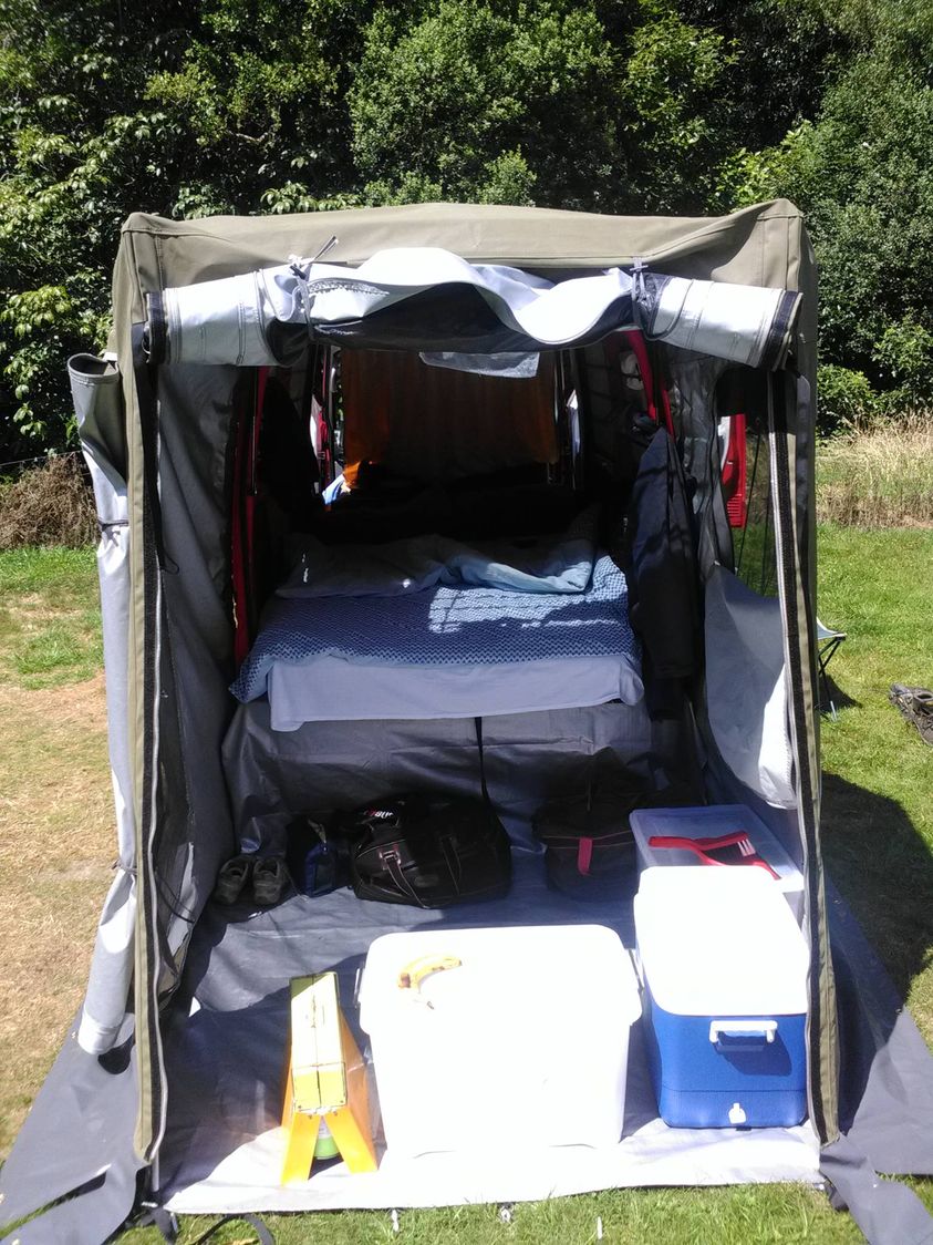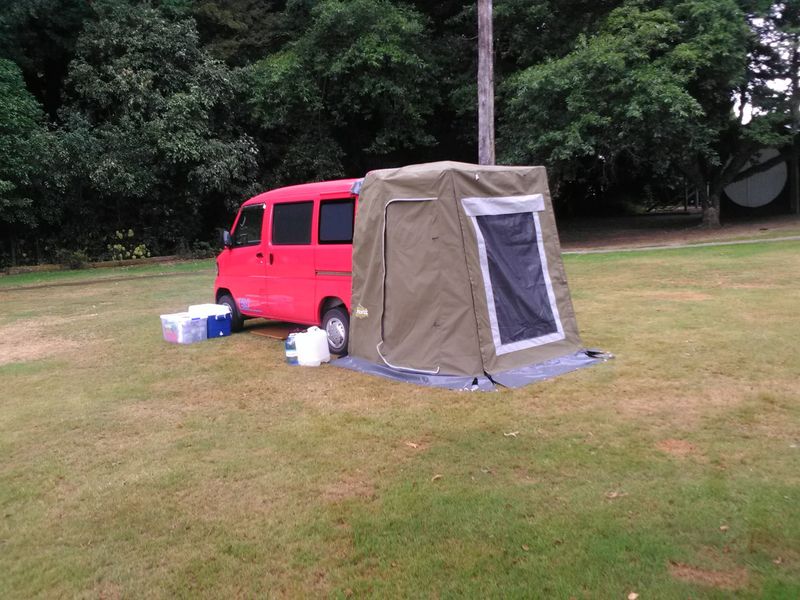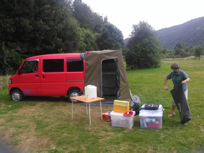 I think I qualify for membership in the small van category. This is Squirrel, our Mitsubishi Miev Minicab van, a whopping 3.4 meters long! On the back we use an awning over the back door from intenze.co.nz, which means the whole of the interior 1.9 x 1.35 metre space is for sleeping. In February we drove from Wellington to Little River on the Banks Peninsula, and only had to recharge 17 times (its electric). Looking forward to sharing ideas for space-saving and packing stuff into small spaces.