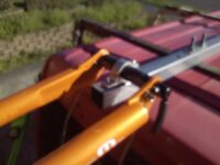 Having hung the bike off the roof racks, the bike is firmly strapped to the van with two ratchet straps at the top, and two at the bottom. The two top straps attach to the seat stays and go forwards and up to attach to the roof bar legs, where they attach to the van. When these are tensioned (equally) the upward tension lifts the bike, putting upward pressure on the hanging bracket, and the forward tension draws the bike in towards the van, and the sideways tension hold the bike horizontally so it doesn’t swing going around corners. Each end of the upper straps attaches to a different roof bar to spread the load.