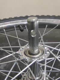 The hitch I am using attaches to the left side of the rear axle, and protrudes a few centimetres. The hitch on the trailer is in two parts, the part which attaches to the bike, and the part which attaches to the drawbar. These are joined by a steel spring with a plastic insert, which allows the trailer to follow the bike around corners and over bumps without scrubbing the tyres or straining the hitch. This puts the pivot point for the hitch about 70mm from the rear drop out, which in turn is 70mm from the centre line of the wheel.