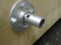 The draw bar attachment is almost identical, but the galvanised pipe is 100mm long, and has two holes drilled in it to match those in the draw bar. The external diameter of the galvanised pipe (21.5mm) matches the internal diameter of the draw bar. The pipe is screwed into the same type of flange, which is bolted onto the front of the trailer at the appropriate height and distance from the centre line.