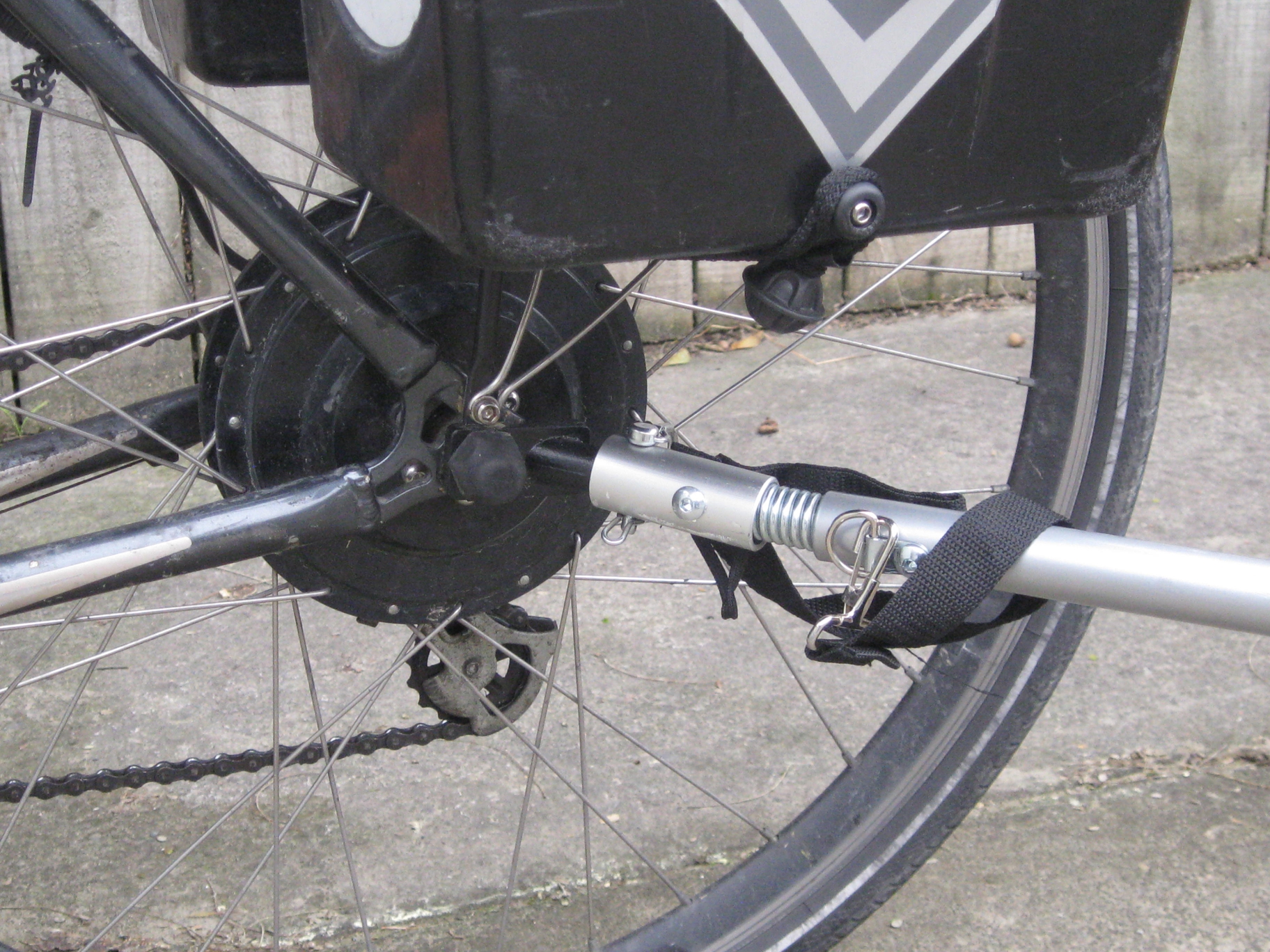 The attachment of the hitch to the bike went on without too much difficulty (could you attach a hitch without a hitch?). The hitch needed drilling out from 10mm to 12mm to fit over the axle. I got a 12mm 1.5 metric nut to fit the axle and to fit into the recession the hitch, and after a slight modification to my pannier rack mounts, it went on fine. Unfortunately the original nut that came with the electric motor wheel was 18mm across the flats, the new one is 19mm, so I have to carry an extra spanner!