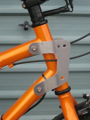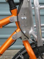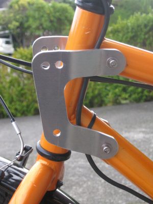 Luckily for me, 20,000km away, I have a son who is a qualified general technician, who has access to some sophisticated CAD/CAM equipment for cutting and bending some rather nice materials. So I again did some very careful measuring, and did a reasonably accurate rough design, which Richard interpreted into two absolutely superb brackets. The bike is not as accurate as the brackets, so I needed to relieve the bike attachment holes in the brackets by a total of 0.5mm to fit the slightly mismatched lugs, but the bolts between the rack and the brackets just slipped through all 6 holes – magic! When all was tightened up, the rack was as firm as could be, really rigidly fixed to the bike.