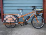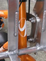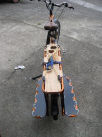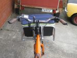 Pictures of the rack fitted to the brackets. The orange sections of tubing are covered in a 3M reflective vinyl, the same vinyl which is used for the sign writing at the rear, and around the edge of the footboard frame (covering the scrapes and damage that a shop soiled bike will have). Its a pretty good match for the metallic orange Yuba paint, until you shine headlights on it at night, then its like a big Christmas Yuba!