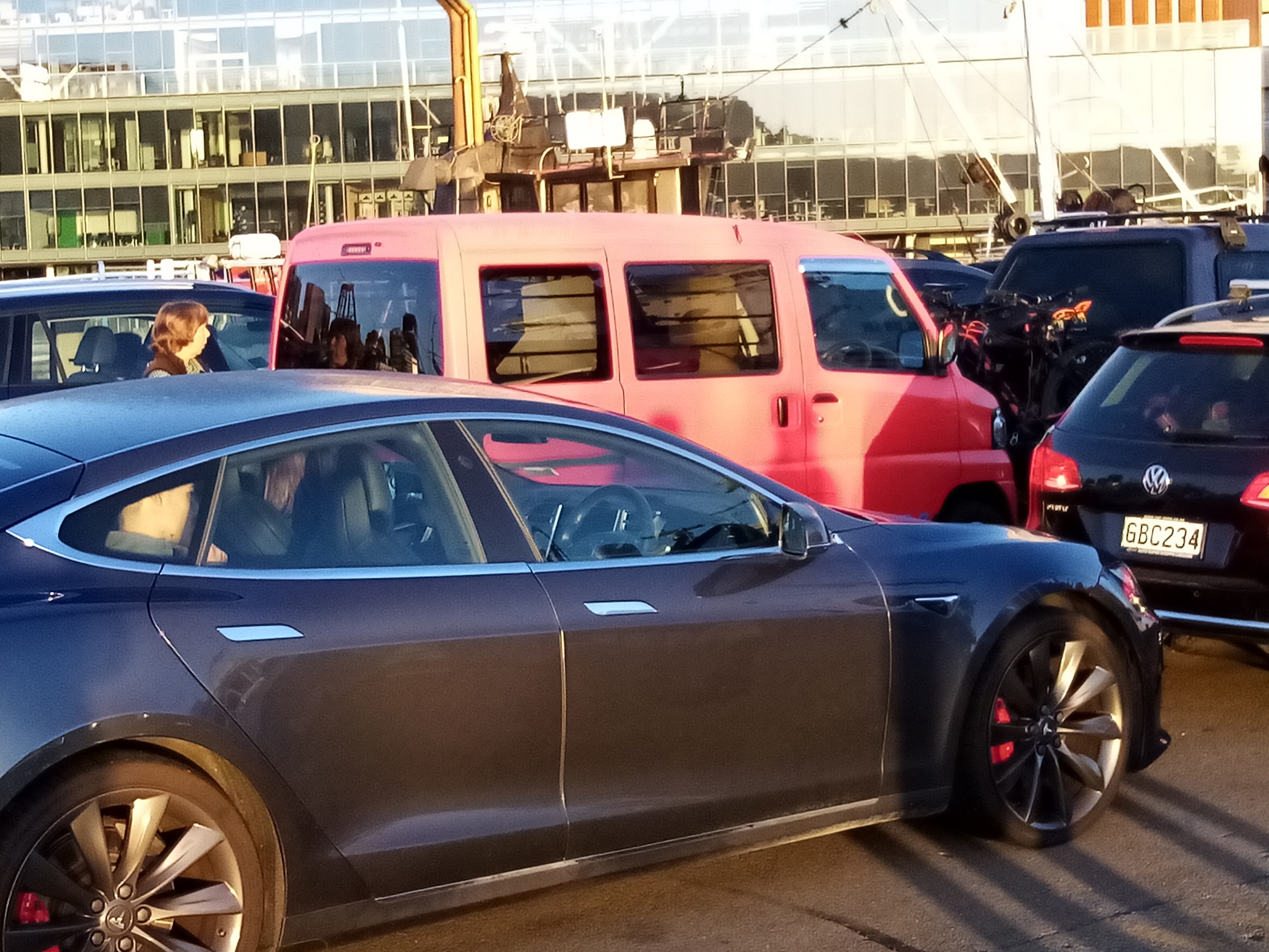 Squirrel hiding behind a Tesla, waiting to board the Bluebridge Ferry