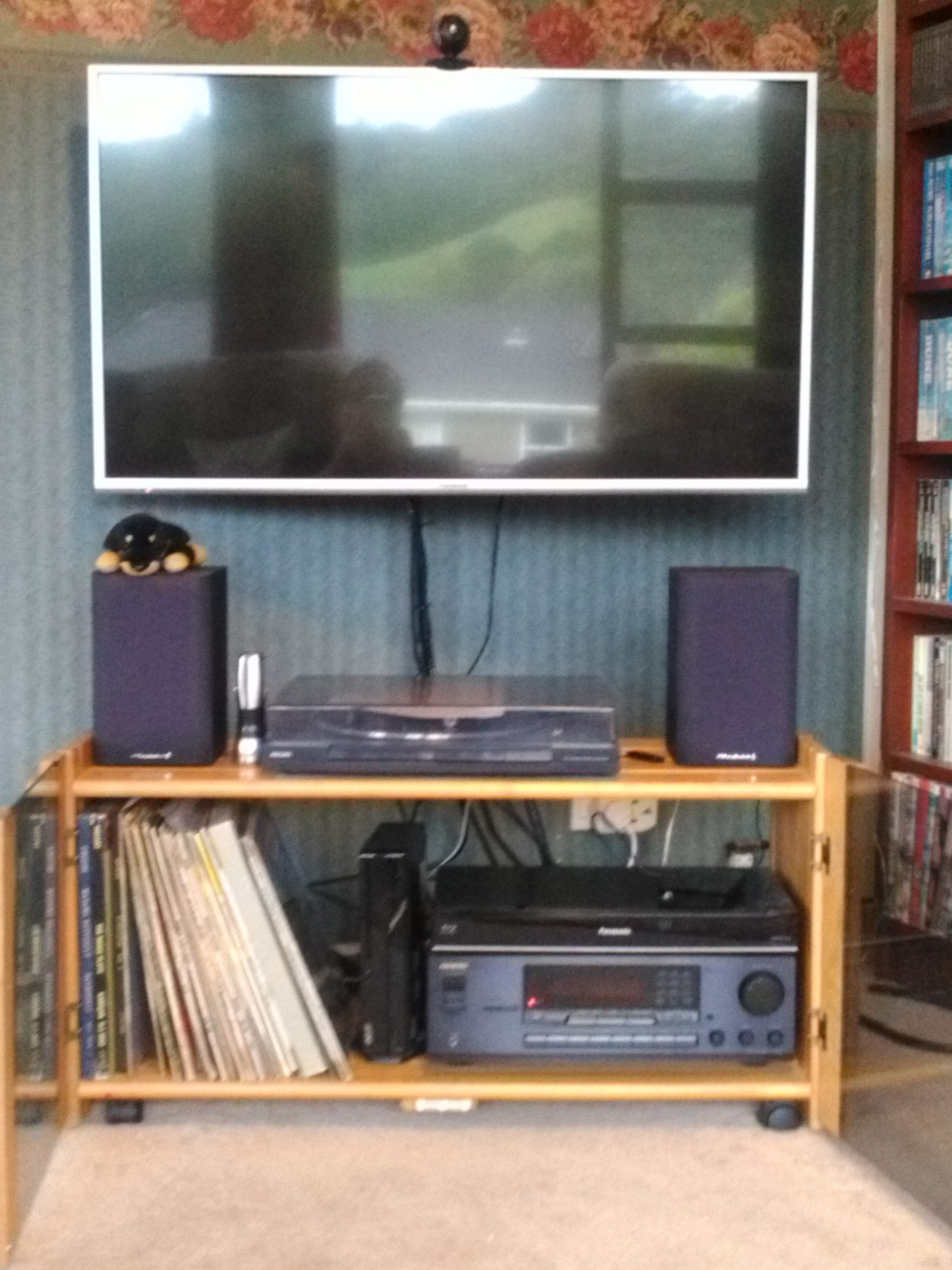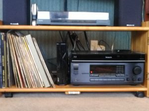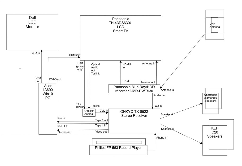 In the picture above, you can see the ACER computer (centre – vertical box), the ONKYO receiver (bottom) and the Panasonic Freeview recorder, and above the Wharfedale Speakers. The deck is a cheap Philips item, which is surprisingly good. There are a pair of KEF C20 speakers also attached for listening to music. Below is a schematic of how the various components are connected. Simple isn’t it?