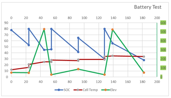 and a graph of Elevation, State of Charge and Cell temperature as the journey progressed.